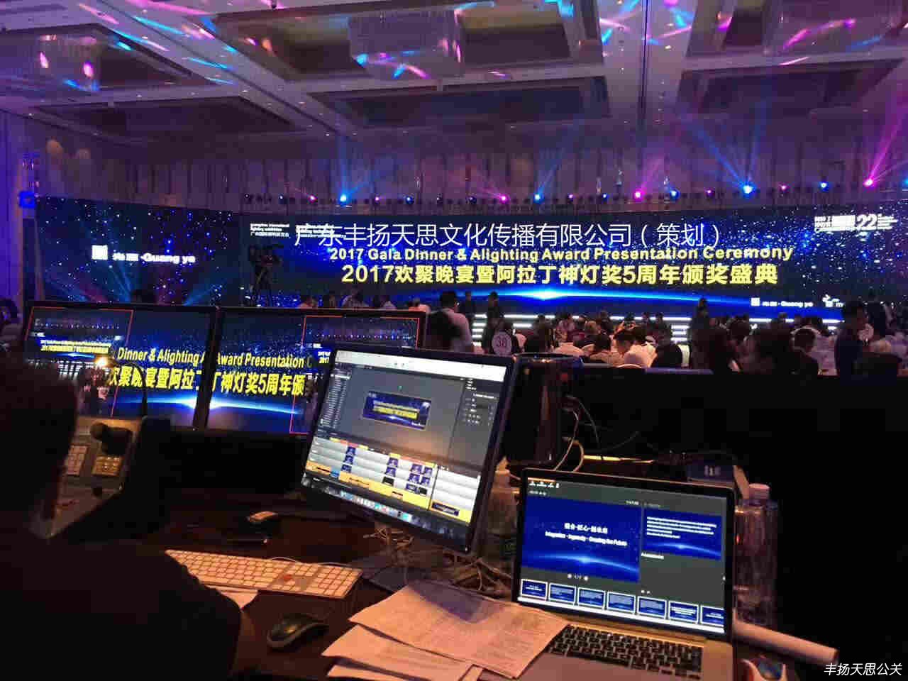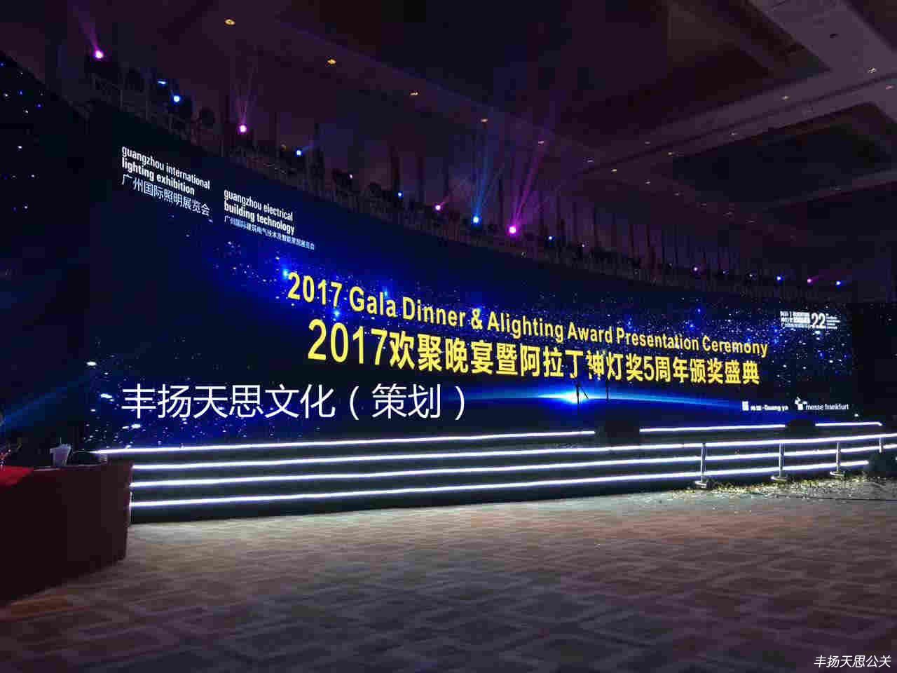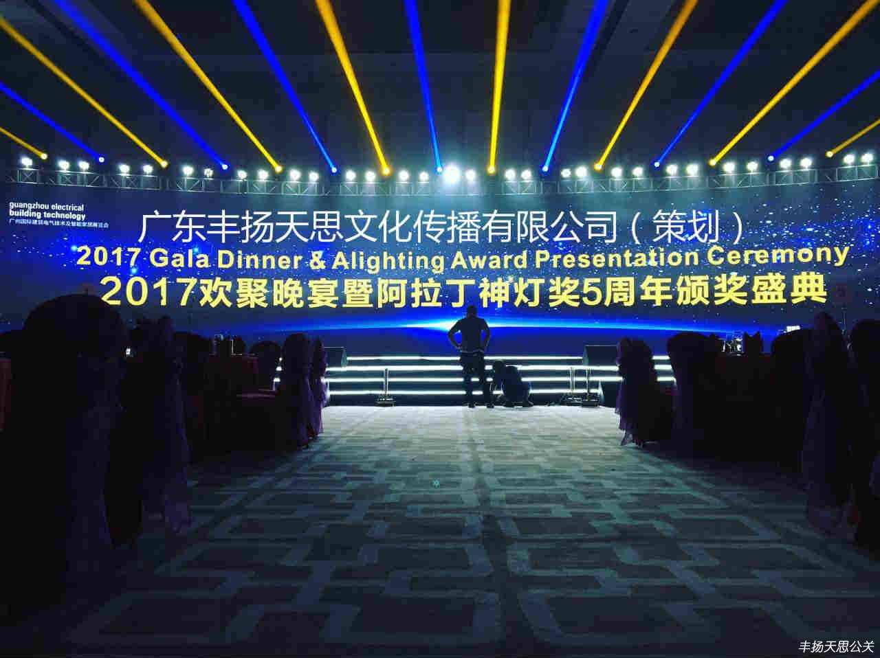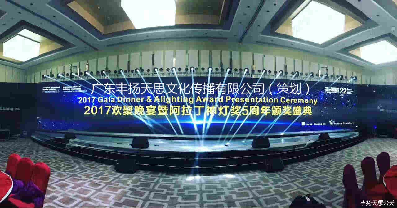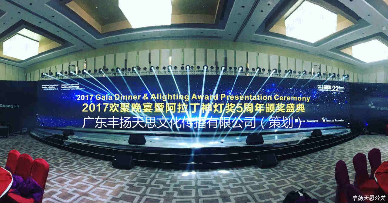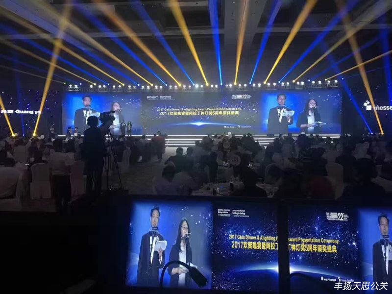 6月9日晚,2017廣州國際照明展覽會歡聚晚宴&阿拉丁神燈獎頒獎典禮在廣州南豐朗豪酒店隆重舉行。此時22周年傳承的盛典由廣東豐揚天思文化傳播有限公司主辦,整體晚會的策劃流程和執行方案。現場共接納了1000多位業內知名人士共同見證這一榮耀時刻,晚會的頒獎典禮也獲得了專業人士的一致好評。