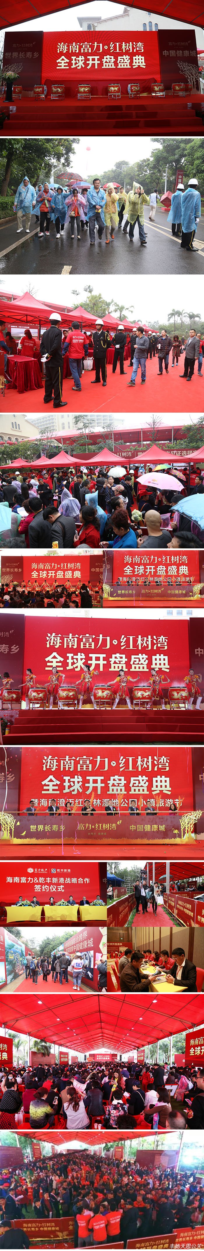 2016年3月12日,中國養生健康旗艦大盤——富力紅樹灣迎來了迄今規模最大的一次集中開盤,四大組團華麗面世。世界長壽鄉,中國健康城,海南富力紅樹灣,8000畝恢弘鉅作,6年醇熟社區,吸引了5000余名來自全國各地的購房者前來選購,**場面堪比春運,4小時**2200余套,總金額高達18億,再創海南銷售奇跡。