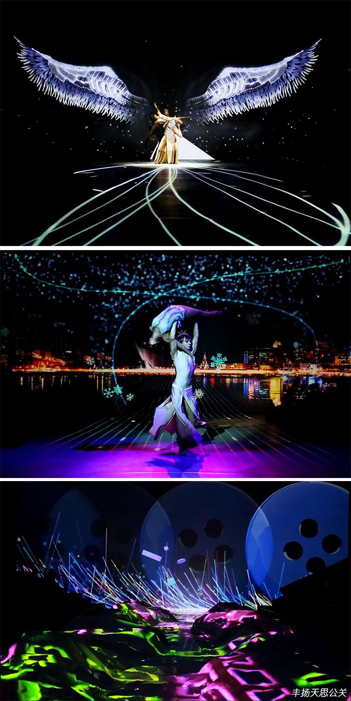 全息投影舞美影像與演員舞蹈表演互動結合,邊沿極具藝術張力與科技感、時尚感