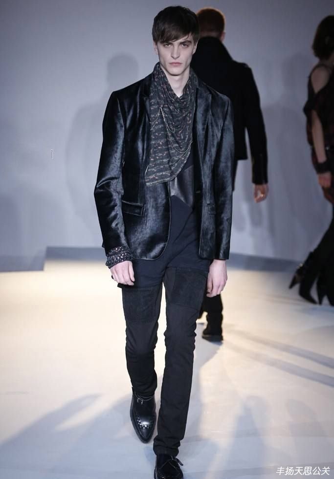 簡陋的混凝土空間和照明,襯托服裝的堅硬感與熟悉感。黑色皮革機車外套、標志性的格子圖案,絲綢及花呢材質等讓人聯想到“朋克”。整個系列的特殊之處在于精致細小的金屬鏈,成為男女裝的聯系點,既有堅硬又伴隨柔軟的雙重內涵。